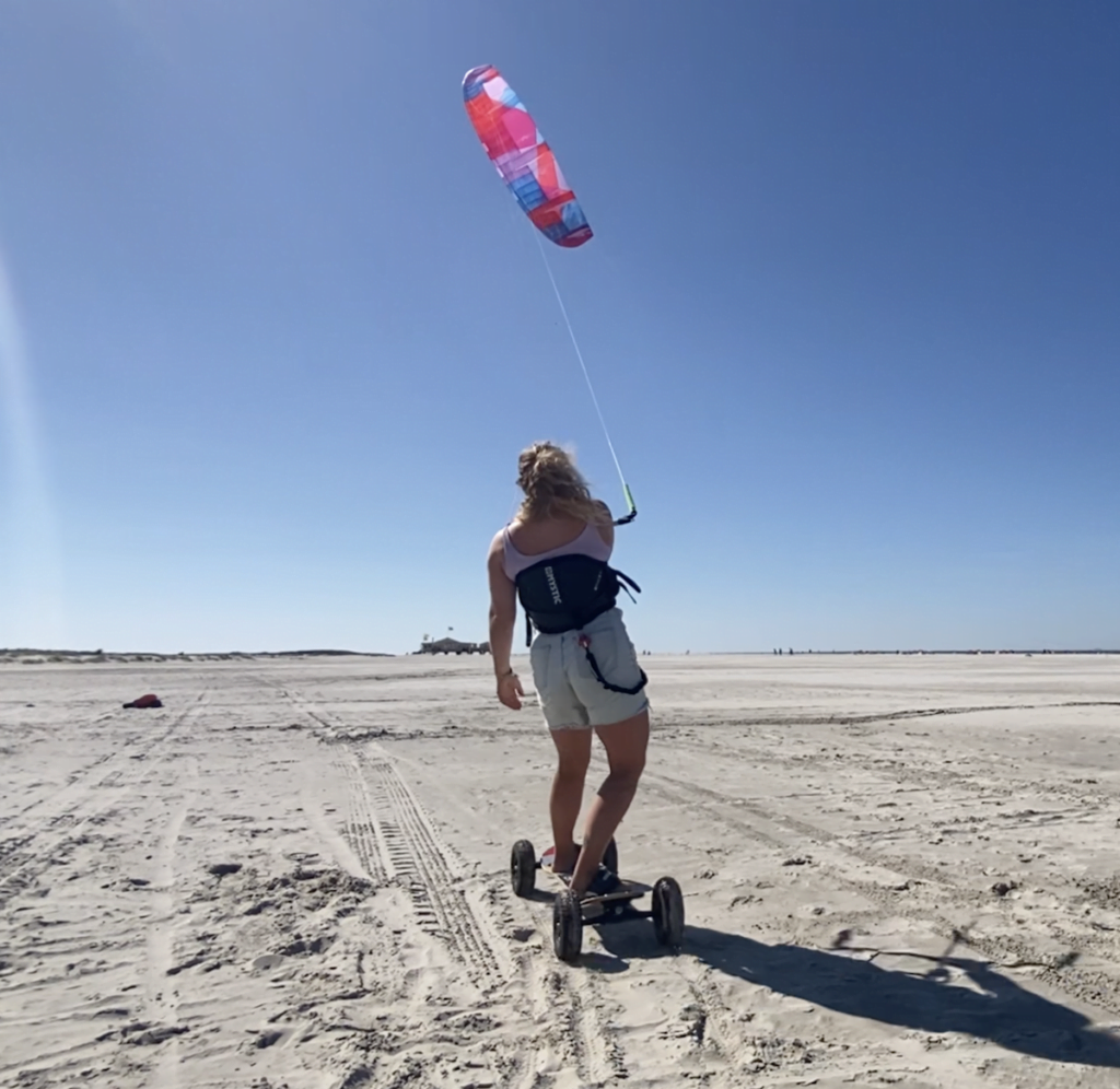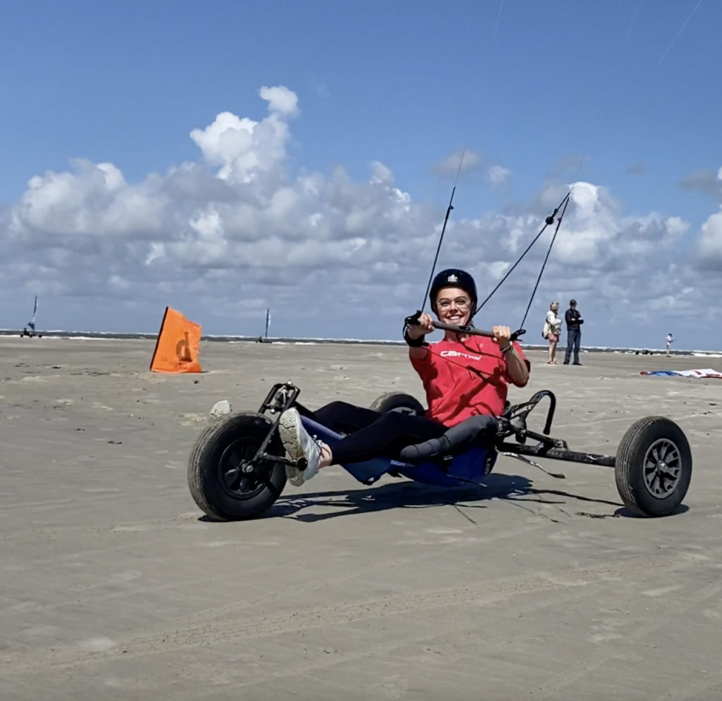 In je handen voel je de wind aan de vlieger trekken. Het strand vliegt onder je door. Met je voeten vertel je de buggy precies waar je heen wil.